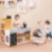 Legetøjsbutik i træ til børn fra 3 år – med indkøbsvogn, kasseapparat og kridttavle