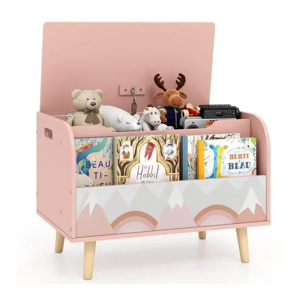Legetøjskasse med boghylde / legetøjsopbevaring i træ med låg / lyserød børnemøbel