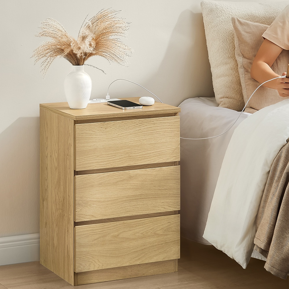 Sengebord med 3 skuffer og indbygget strømstik + USB