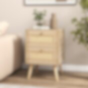 Sengebord i træ med kunstrotting, skuffe og åben hylde