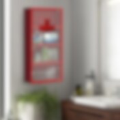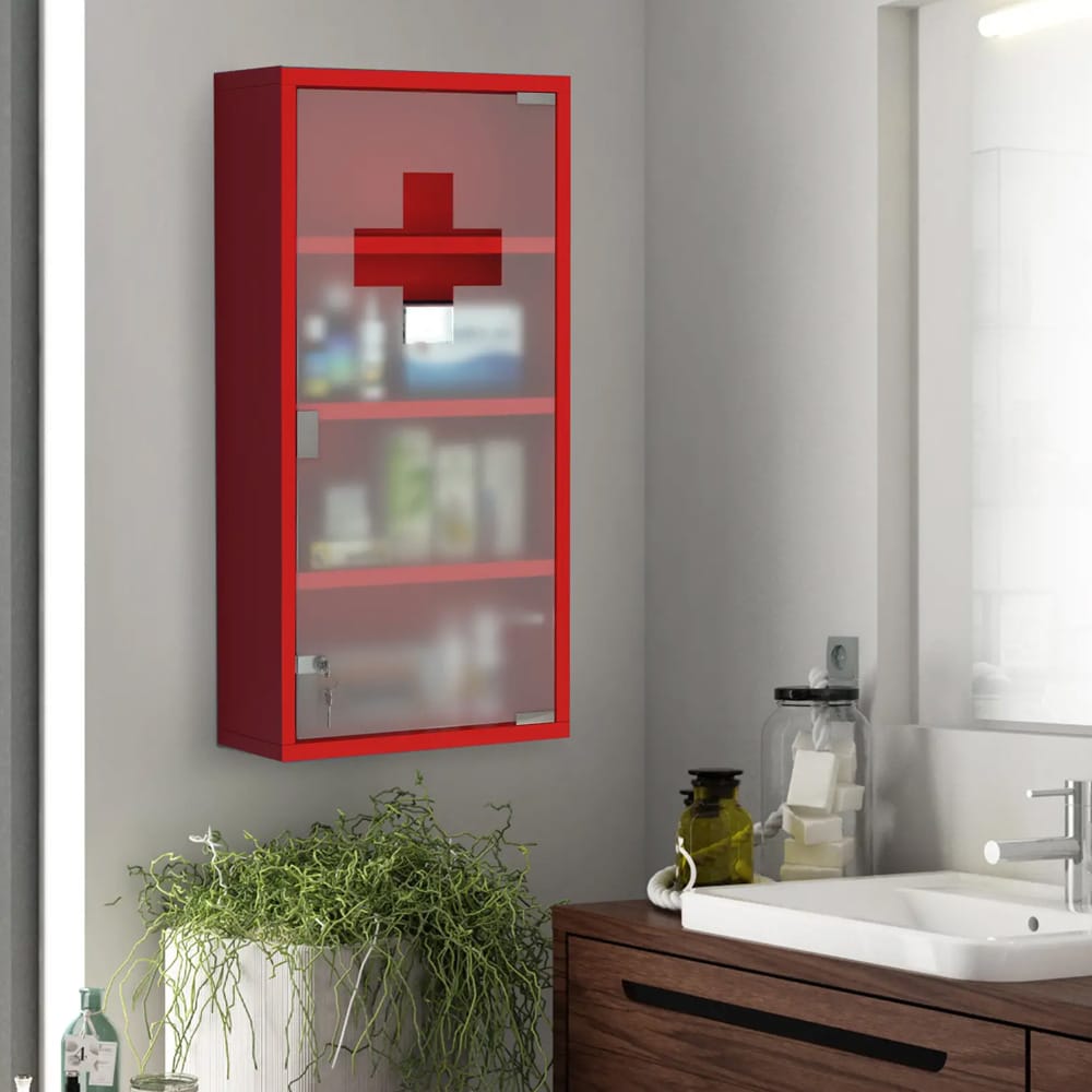 Medicinskab i stål med matteret glasdør / aflåseligt apoteksskab / vægskab med 4 hylder - Rød