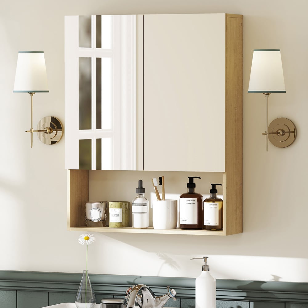 Vægmonteret spejlskab 75x60 cm / badeværelsesskab med spejllåger / badeværelsesskab med hylder og åben opbevaring