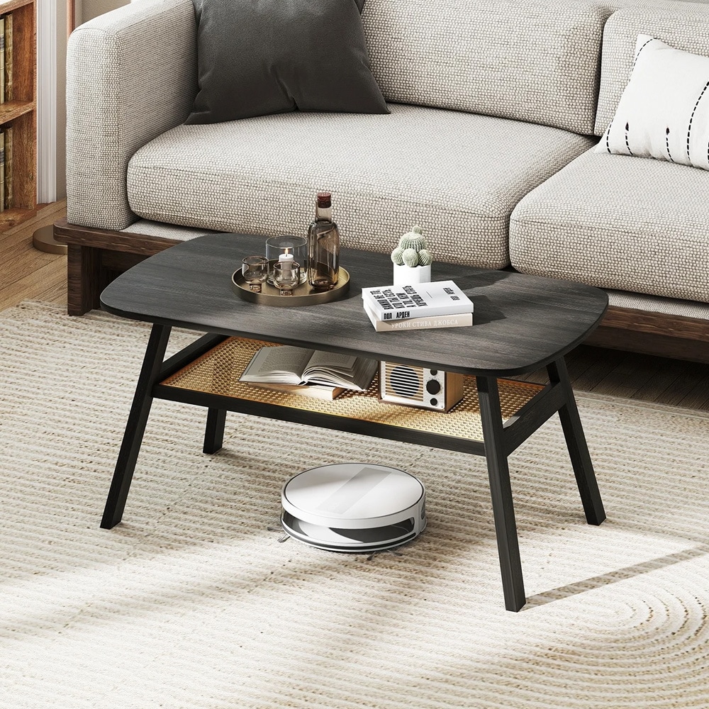 Sofabord i træ med hylder i kunstrotting - Mørkegrå