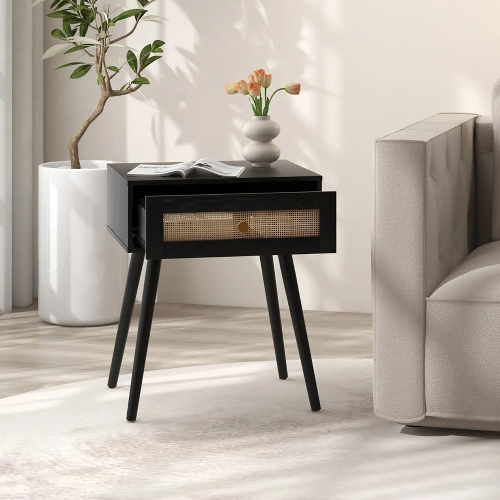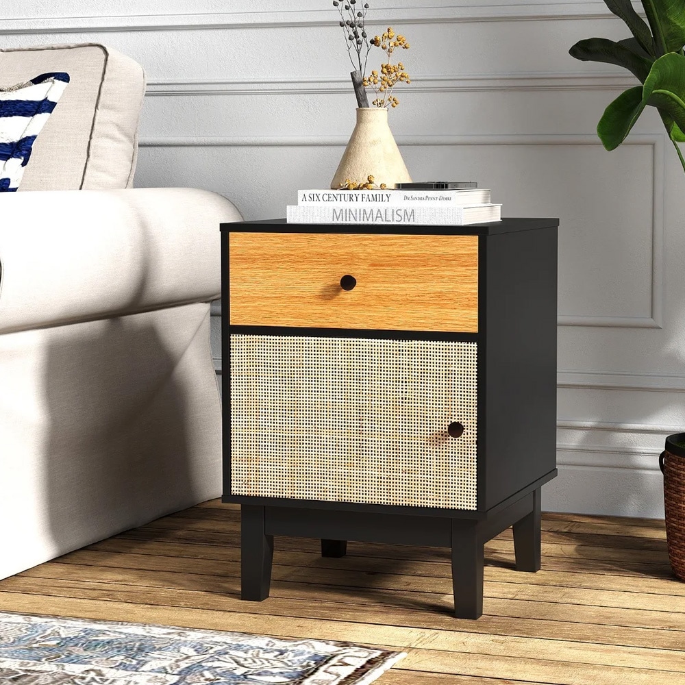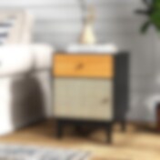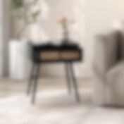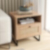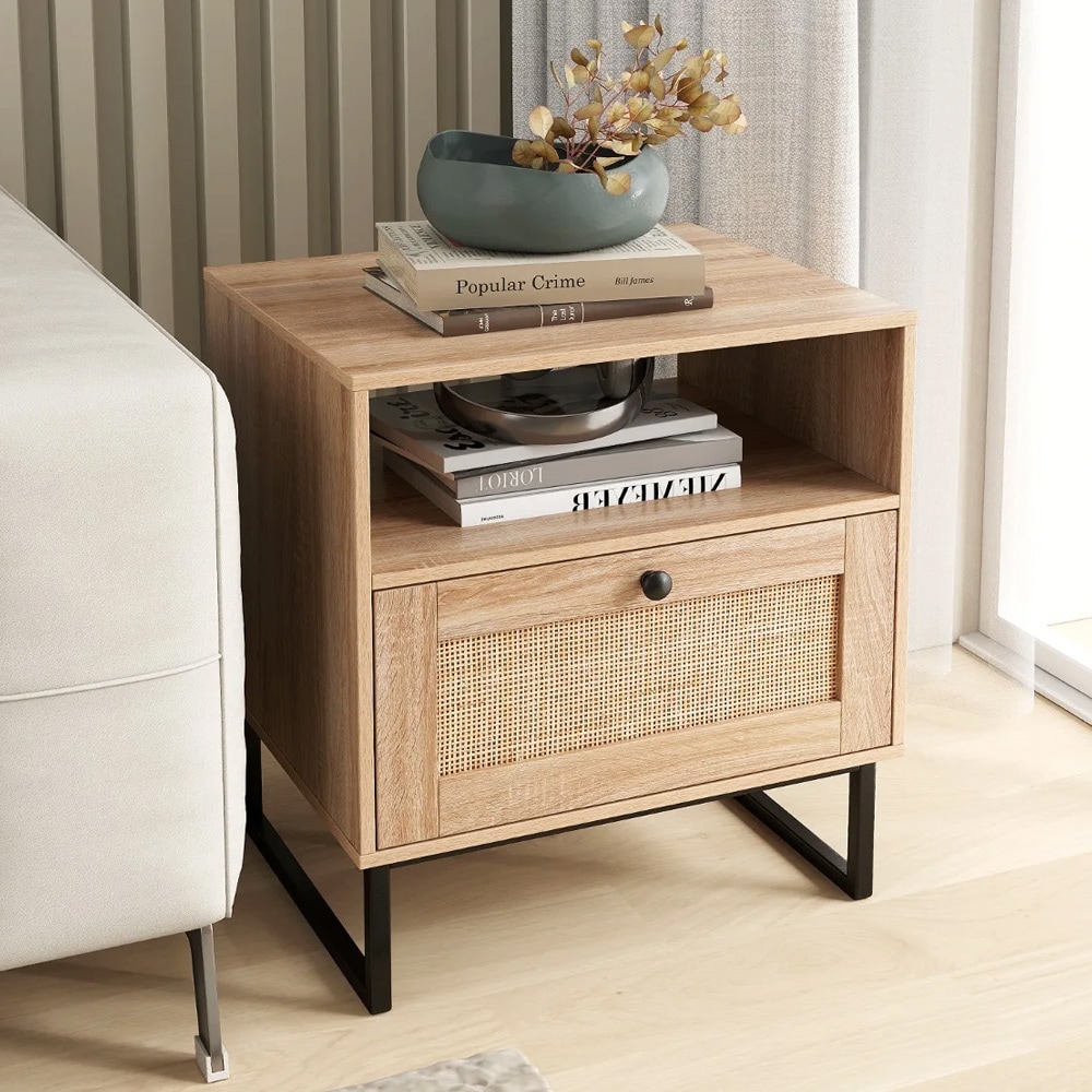 Sengebord i træ med kunstrotting, skuffe og åben hylde