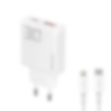 Dudao GaN USB-oplader 30W med 1xUSB, 1xUSB-C og USB-C til Lightning-kabel - Hvid