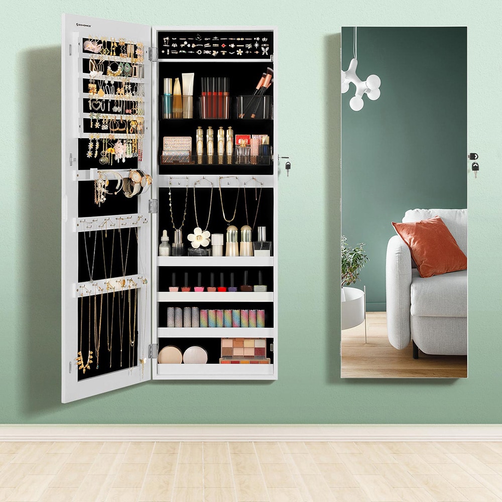 Smykkeskab med spejl og LED-belysning til væg- eller dørmontering - 108x36cm